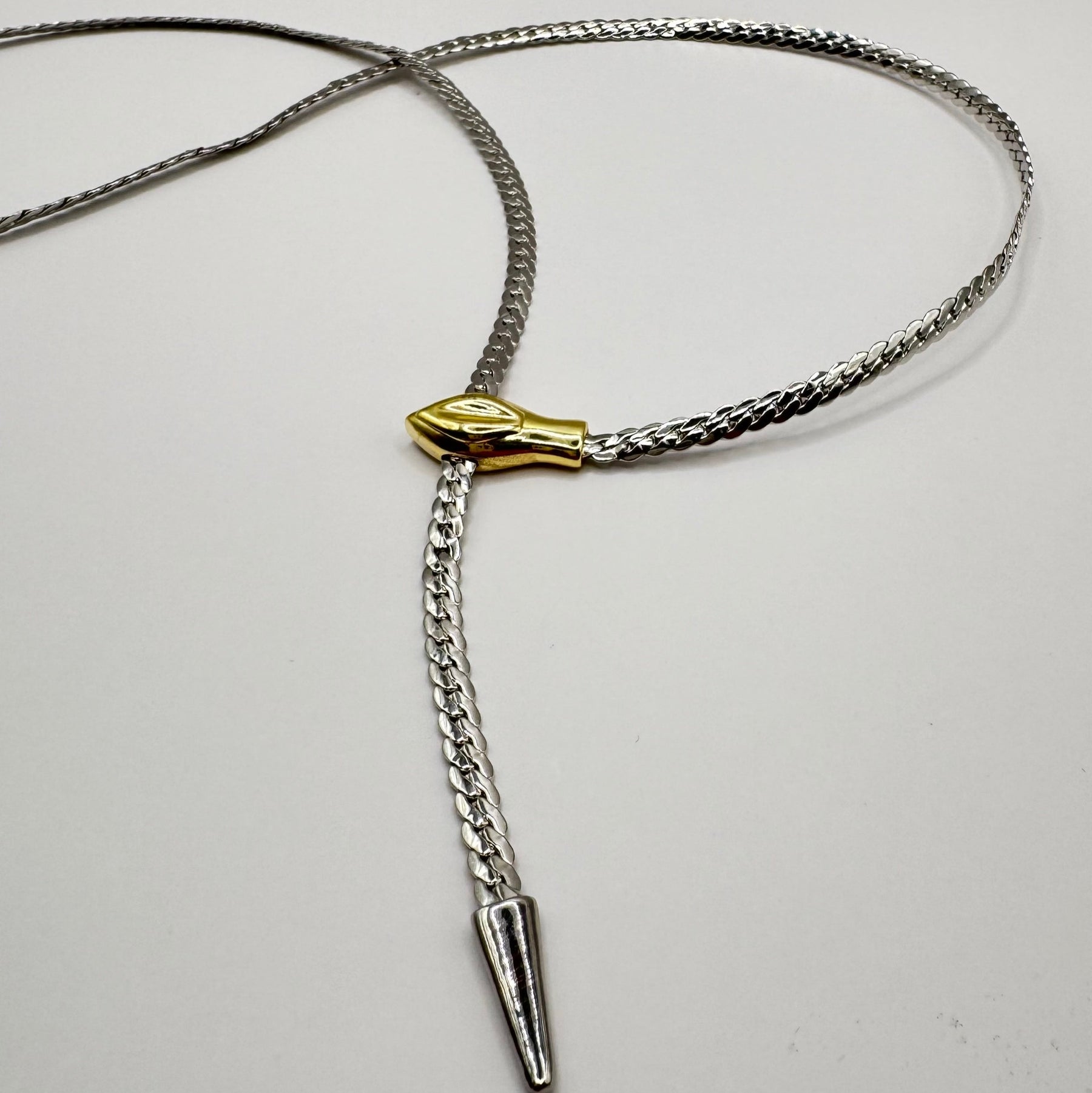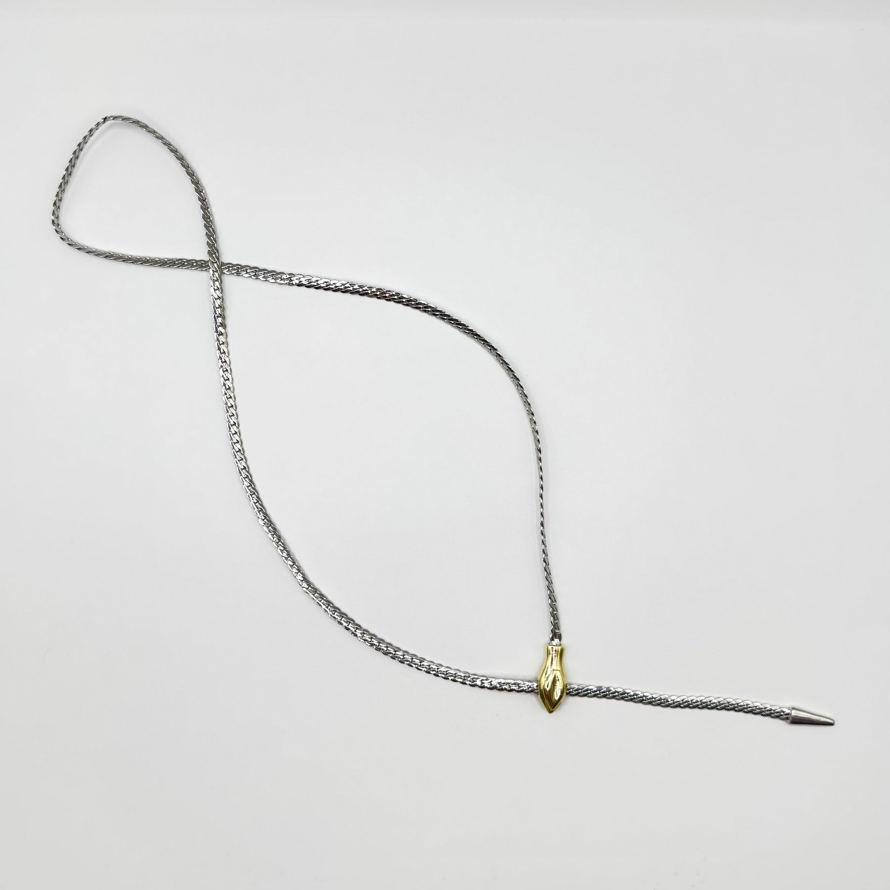Seris es una cadena corbata fluida que se desliza como un cuerpo en movimiento, uniendo sus extremos a través de una figura dorada con forma de cabeza. El contraste de metales y las puntas cónicas crean una silueta audaz, casi ritual. Es una joya que no solo adorna, sino que transforma.