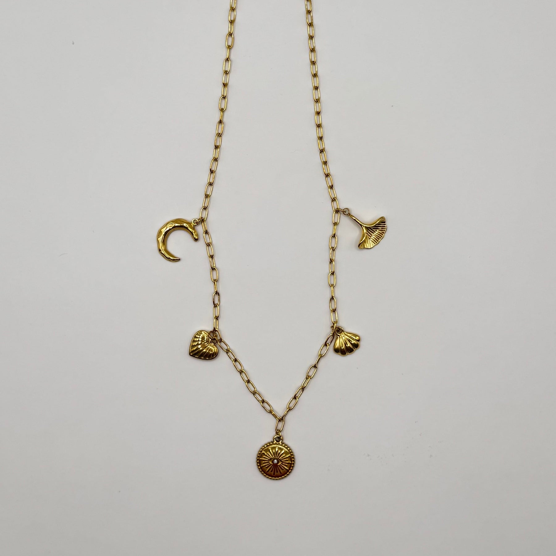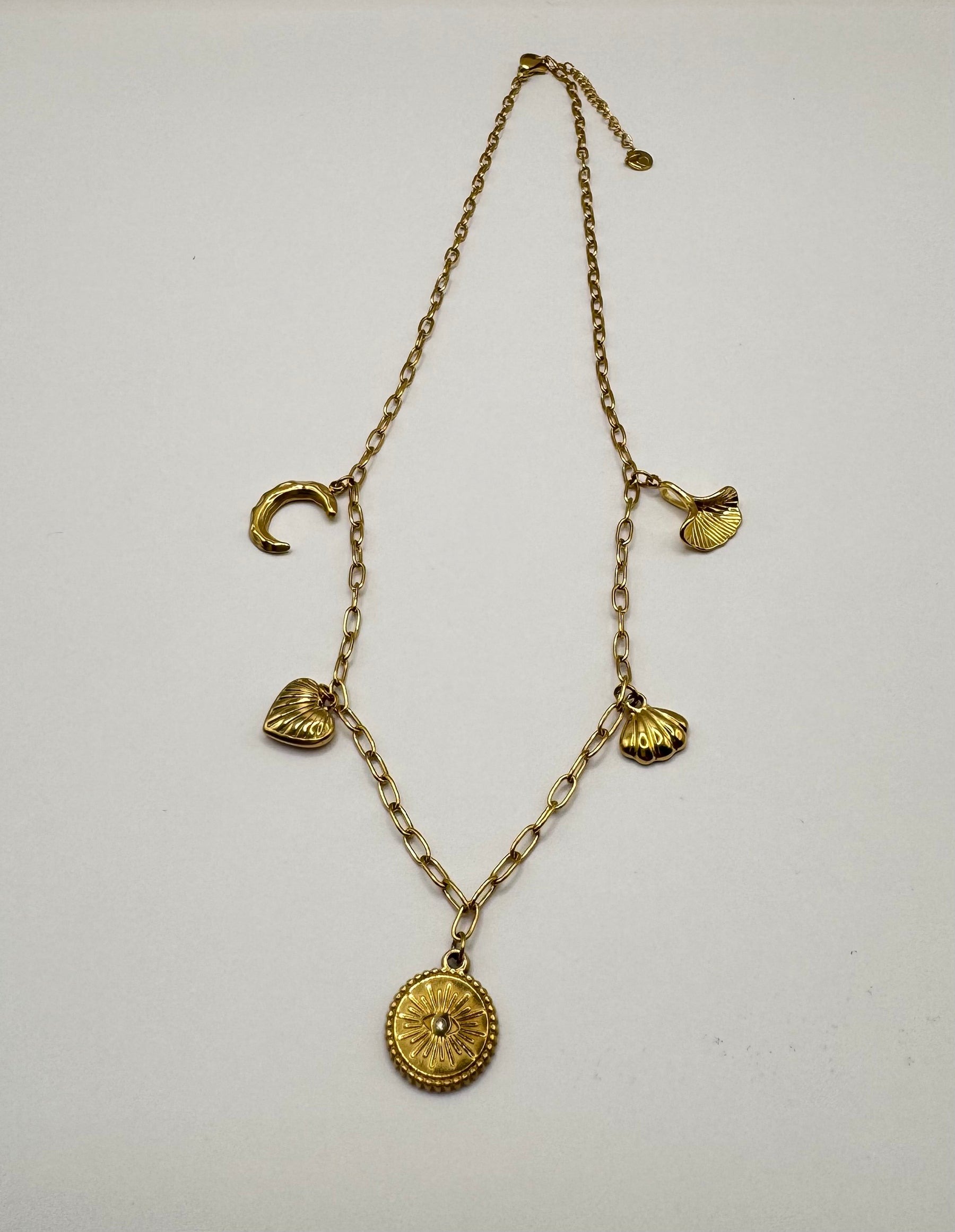 Zaha es una cadena dorada decorada con dijes que parecen recogidos bajo el sol: caracolas, conchas, una luna creciente y un medallón solar en el centro. Cada pieza tiene textura y carácter, como símbolos que solo tú sabes descifrar