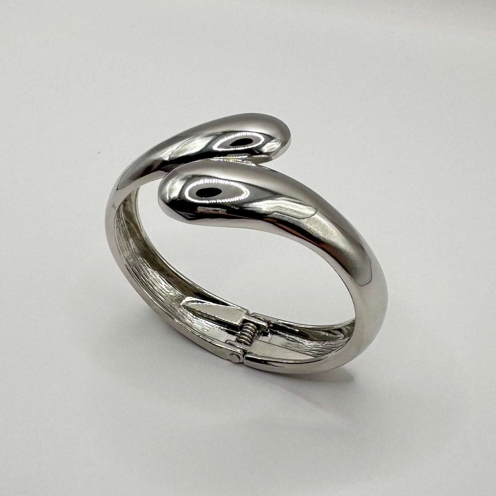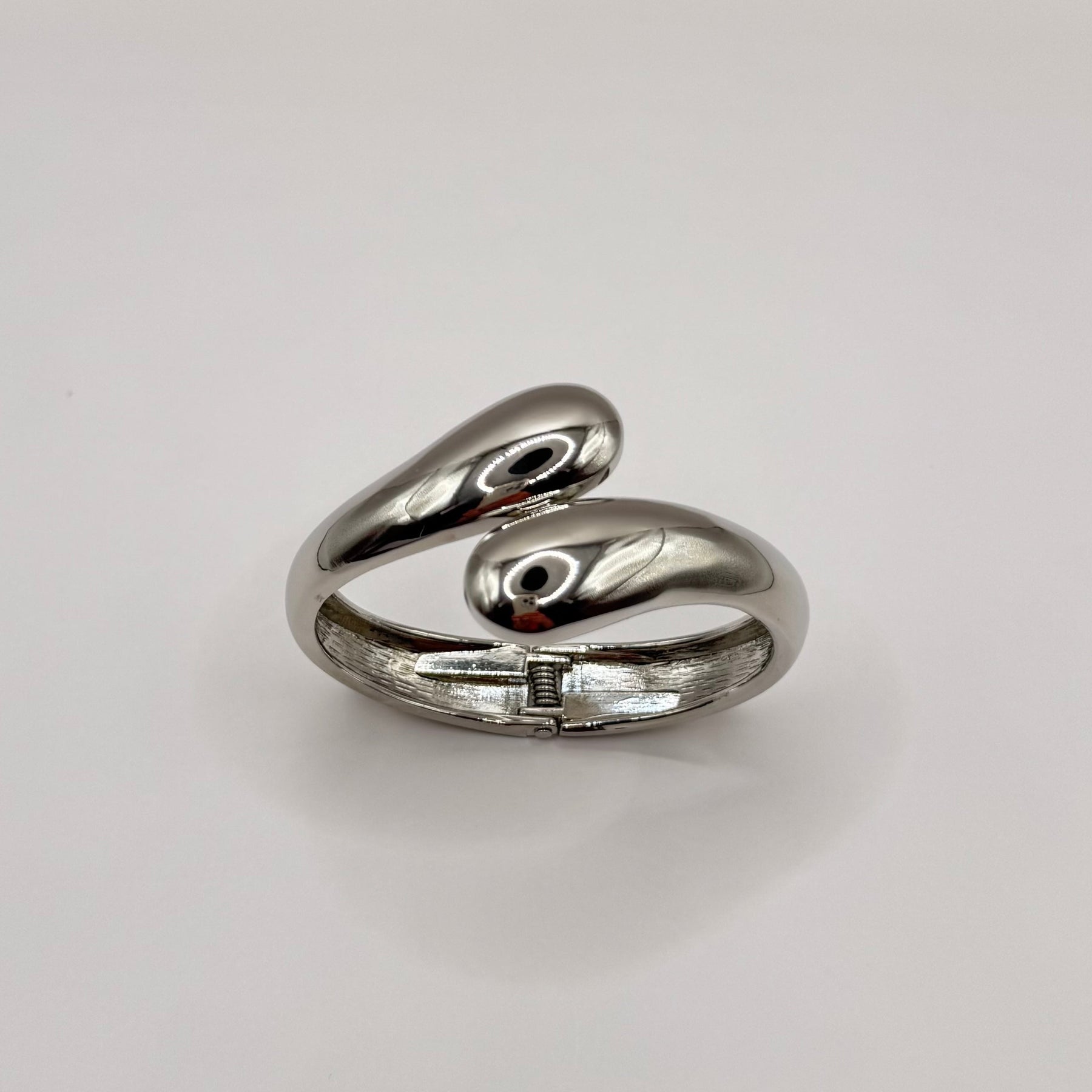 Isel es una pulsera plateada de estructura sólida, con un diseño envolvente que parece un abrazo entre dos gotas metálicas. Tiene un acabado pulido tipo espejo y un sistema de bisagra invisible que la mantiene cerrada con firmeza. Su diseño es limpio, pero deja huella.